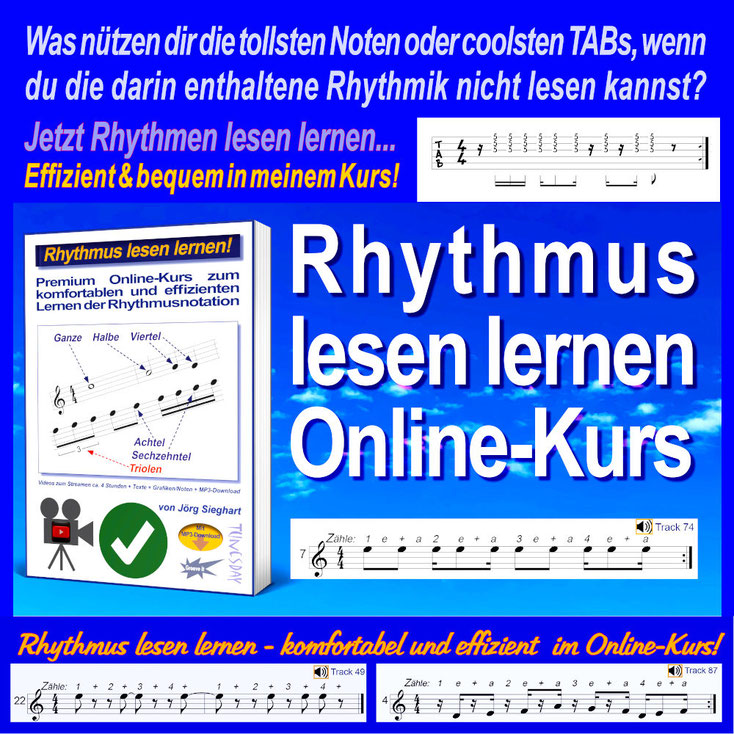 Es geht methodisch darum in kleinen Schritten die gängigen rhythmischen Notenwerte zu erfassen - egal, ob in herkömmlicher Notenschrift oder Tabulatur (TABs) für Gitarre. Durch die aufeinander aufbauenden Übungen und hilfreichen Erklärungen wirst du Schritt für Schritt ins Rhythmuslesen eingeführt. Zahlreiche Video-Tutorials leiten dich sicher zum Ziel. Erfahre mehr...